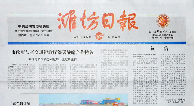 濰坊市市長劉曙光給魯臺會展中心工程各參建單位、全體參建人員的賀信在濰坊日報2012年8月