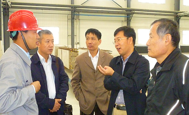 上圖為徐鵬強(qiáng)董事長(右二)在沈陽工業(yè)化部品生產(chǎn)車間與車間負(fù)責(zé)人交流