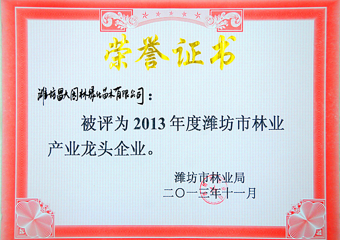 2013年11月15日,濰坊市林業(yè)產(chǎn)業(yè)工作會議在臨朐縣召開,在這次會議上,集團園林綠化苗木有限公司被評為“2013年度濰坊市林業(yè)產(chǎn)業(yè)龍頭企業(yè)”。根據(jù)有關(guān)規(guī)定,濰坊市級林業(yè)龍頭企業(yè)將在同等條件下優(yōu)先享受各級財政造林補貼、撫育補貼、貼息、稅費減免等政策優(yōu)惠。 集團園林綠化苗木有限公司自成立以來,依托集團的平臺優(yōu)勢,深入實施林業(yè)產(chǎn)業(yè)化導向,積極調(diào)整、合理布局苗木結(jié)構(gòu),按照品牌化運營,差異化競爭的思路,推行精細化管理,做到了“人無我有,人有我優(yōu),人優(yōu)我奇”,培養(yǎng)了一大批精品苗木,為濰坊林業(yè)產(chǎn)業(yè)發(fā)展、農(nóng)民增收、農(nóng)業(yè)增效起到了良好的示范和推動作用。