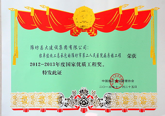 2013年12月27日,中國施工企業(yè)管理協(xié)會在北京召開“2012-2013年度國家優(yōu)質(zhì)工程獎”表彰大會,為獲獎?wù)哳C獎。由集團(tuán)第一分公司施工的濰坊市第二人民醫(yī)院病房樓工程獲此殊榮。 國家優(yōu)質(zhì)工程獎是我國工程建設(shè)質(zhì)量方面跨行業(yè)、跨專業(yè)的國家級榮譽(yù)獎勵,已經(jīng)成為政府提倡、社會知名、企業(yè)向往、專家認(rèn)可、實(shí)踐過硬的著名品牌,以其權(quán)威性、規(guī)范性、指導(dǎo)性、示范性在工程建設(shè)領(lǐng)域享有崇高的聲譽(yù)。