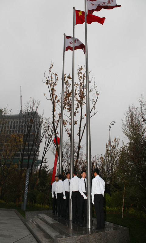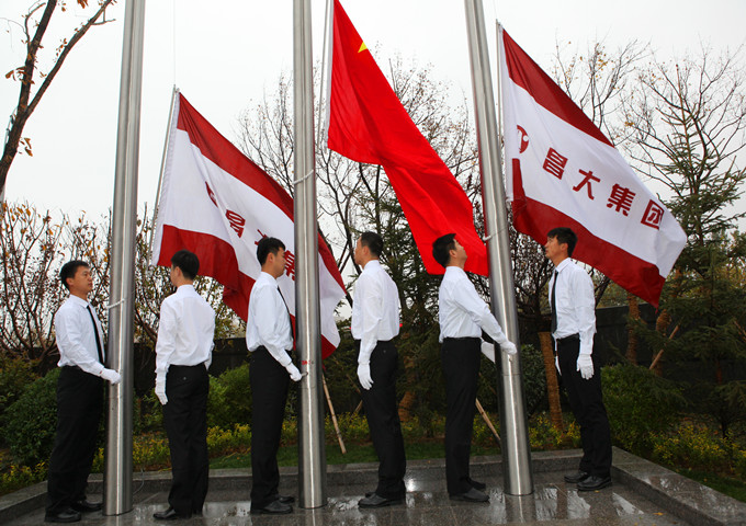 2013年11月9日早8時,集團在新辦公樓廣場升旗臺前隆重舉行了首次升國旗(企業(yè)司旗)儀式。 五星紅旗是中華人民共和國的標志和象征,五星紅旗作為中華民族五千年歷史上第一面代表全體人民意志的民族之旗、團結之旗、勝利之旗、希望之旗、吉祥之旗。舉行升旗儀式,就是昭示人們祖國的利益高于一切,要熱愛祖國。集團喬遷新辦公樓當天舉行升旗儀式,意義重大。 早7時50分,在集團新辦公樓辦公的集團高管層領導、集團總部及基層單位(子公司)全體員工300余人集結完畢,列隊站立,準備迎接升旗儀式。7時57分,6名護旗手邁著整齊的步伐走向升旗臺;8時整,隨著主持人一聲振奮人心的“奏國歌、升國旗”,伴隨著莊嚴的《中華人民共和國國歌》,鮮艷的五星紅旗在隨后升起的兩面昌大司旗映托下,在行注目禮的三百余雙眼睛注目中冉冉升起。昌大人在此時此刻用自己的方式表達了對祖國的敬意,也闡釋了對企業(yè)新的美好時代的向往和期盼。新的時代,昌大已經走來,新的時代,昌大正快步向前!