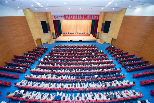 文化宮穹頂璀璨,碧華應(yīng)時?!皥F結(jié)凝聚力量、奮斗創(chuàng)造奇跡,挺膺擔當、不負時代、不負華年,全面推進企業(yè)高質(zhì)量發(fā)展!”的大幅標語催人奮發(fā)。上午九時,會議如期開幕。集團董事長徐鵬強、總裁朱九洲以及穆乃杰、姜建魯、房海、吳杰、劉雁冰、楊成國、惠守江、孟憲禮、王建波等高管出席大會并在主席臺就座。集團第八屆職工代表、列席代表,集團中層管理人員、2022年度受表彰的先進集體代表和先進個人以及總部全體人員共337人參加大會。