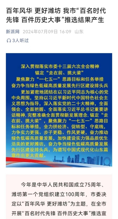 “百名時代先鋒、百件歷史大事”將進(jìn)一步推動全市各級深入學(xué)習(xí)貫徹習(xí)近平總書記視察山東重要講話精神,按照市委十三屆六次全會的部署要求,錨定“走在前、挑大梁”,自信自強、開拓創(chuàng)新、敢為爭先、勇毅前行,在新征程新起點上全面提升各項工作檔次水平,奮力推動綠色低碳高質(zhì)量發(fā)展,加快建設(shè)實力強品質(zhì)優(yōu)生活美的更好濰坊,為譜寫中國式現(xiàn)代化山東篇章作出更大貢獻(xiàn)。