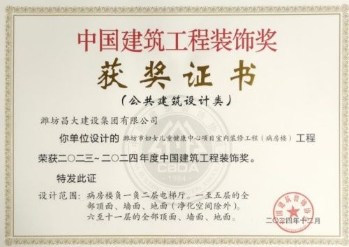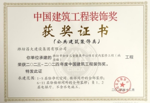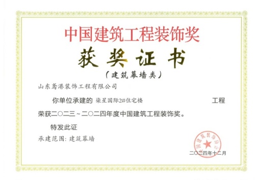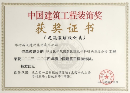 2024年12月10日,中國建筑裝飾協(xié)會在北京召開大會,表彰2023~2024年度“中國建筑工程裝飾獎”工程。集團(tuán)裝飾幕墻工程公司、山東鳶港裝飾工程有限公司的三項(xiàng)工程榮獲五個獎項(xiàng):濰坊醫(yī)學(xué)院附屬醫(yī)院教學(xué)科研病房綜合樓(建筑幕墻類和幕墻設(shè)計(jì)類)、濰坊市婦女兒童健康中心病房樓(公共建筑裝飾類和公共建筑裝飾設(shè)計(jì)類),柒星國際2#住宅樓(建筑幕墻類)。
